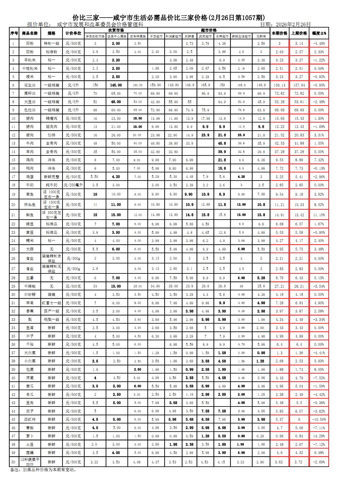 名 称: 【价格监测】咸宁市城区“菜篮子”及生活必需品价格监测(第1057期) 发布日期: 2026年02月26日